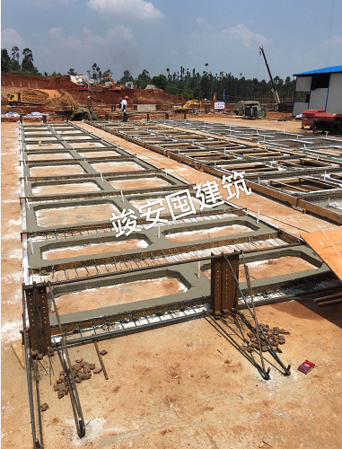 四川竣安囤建筑工程有限公司為專業(yè)預應力拱板施工公司,公司注冊資本為1000萬元。公司經(jīng)營范圍:住宅房屋建筑、房屋建筑工程、市政公用工程、土石方工程服務、防水防腐保溫工程、鋼結(jié)構(gòu)工程、橋梁工程、公路交通工程、地基基礎工程、園林綠化工程施工、水利水電工程、建筑裝飾工程、建筑勞務分包、砼結(jié)構(gòu)構(gòu)件制造、預應力工程專業(yè)承包。 公司現(xiàn)有專業(yè)技術人員22人,均從事預應力拱板施工超過10余年,技術力量強大,現(xiàn)場施工經(jīng)驗豐富,能適應各種預應力拱板施工,專業(yè)技術工人500余人,專業(yè)隔板施工人員60人,木工120人,鋼筋工90人,混凝土工150人,專業(yè)電工、焊工20余人,專業(yè)張拉機手35人,專業(yè)拱板高空滑移就位人員50人,能進行10余個工地同時施工。 公司先后承建了中儲糧荊門直屬庫掇刀分庫、中儲糧監(jiān)利直屬庫、 湖北省荊州川店儲備庫、湖北省咸寧儲備庫、湖南岳陽儲備庫、廣安火車站中直糧庫、湖北江陵儲備庫、湖北孝感儲備庫、廣安武勝國家糧庫、重慶秀山國家糧庫、云南玉溪紅塔區(qū)糧庫、云南西山區(qū)國家糧庫、云南曲靖陸良國家糧庫、云南江川糧庫、云南曲靖市糧庫、四川瀘縣嘉明糧庫、四川邛崍固驛種子庫、四川遂寧安居中直庫、云南石林糧倉、云南楚雄牟定糧庫、云南綏江縣糧庫、四川廣安儲備庫、云南盈江拆舊建新糧庫、貴州畢業(yè)糧庫、云南嵩明糧庫、重慶南川儲備庫、云南石林糧庫、遂寧直屬庫安居分庫、云南祿勸糧庫、綿陽三臺直屬庫、重慶渝西南糧庫、重慶墊江儲備庫、重慶永川儲備庫、重慶梁平儲備庫、重慶忠縣儲備庫、重慶江津儲備庫、重慶黔江儲備庫、黔江軍糧站、成都新都儲備庫、四川彭州儲備庫、四川蒙陽儲備庫、四川什邡儲備庫、四川遂寧儲備庫、廣安回龍儲備庫、達州開江物流園儲備庫、大理巍山儲備庫、大理云龍儲備庫、大理祥云儲備庫、云南威信儲備庫、昆明祿勸儲備庫、普洱景東儲備庫、臨滄雙江儲備庫、昭通大關儲備庫、楚雄南華儲備庫,庫房跨度24米。 公司專業(yè)承接預應力拱板板制作,采用空中預制施工工藝,僅需在室內(nèi)地面進行拱板隔板預制。重點在高空利用原有部分圈梁進行加固改造形成張拉臺座,完成下弦板預應力張拉,一次性完成拱板屋架混凝土澆筑,待拱板屋架整體砼達到設計強度時,實施放張,用千斤頂頂起拱板放置專用滑輪車上,運用卷揚機在水平圈梁上滑移至設計安裝位置。本工藝不需搭設滿堂腳手架(僅局部搭設),不需大型機械吊裝,不需大型堆碼場地,比地下預制成本低,安全可靠。比滿堂腳手架耗材少,是一種經(jīng)濟實用型工藝。